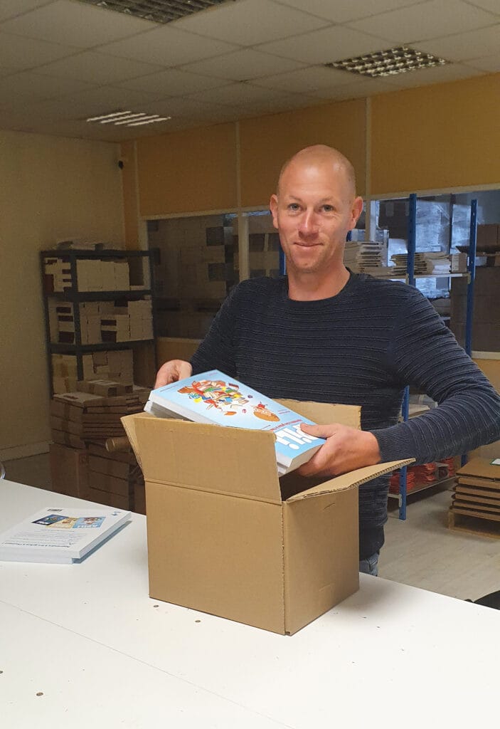 Les 3 000 premiers exemplaires s’installent dans son garage, dans l’attente de vous rejoindre aux quatre coins du globe. Il ne reste plus qu’à les expédier… Une étape plus facile à dire qu’à faire face à l’immensité de la tâche.