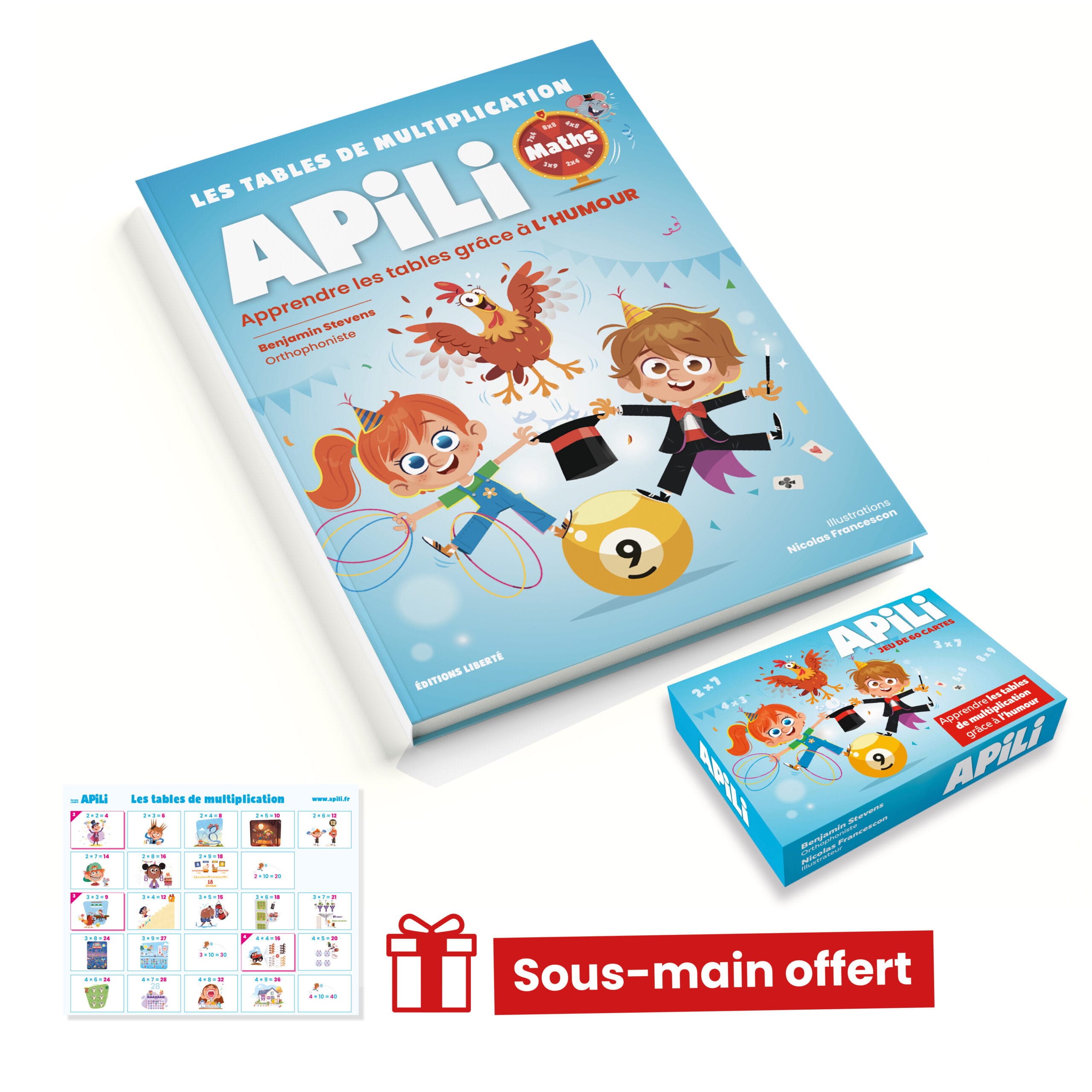 Pack DUO Tables de Multiplication Apili – 1 Livre + 1 Jeu de Cartes + sous main offert